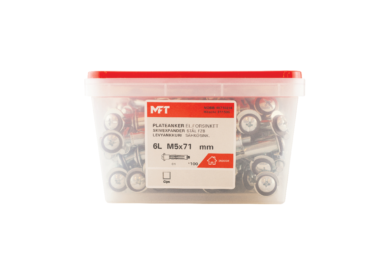 Product no. | Maks skjær vegg gips 1 x 13 mm | Maks skjær vegg gips 2 x 13 mm | Maks uttrekk tak gips 1 x 13 mm | Maks uttrekk tak gips 2 x 13 mm | For plate- tykkelse | Bor- dim. | Anker- lengde | Skrue- dim. | Skrue- lengde |