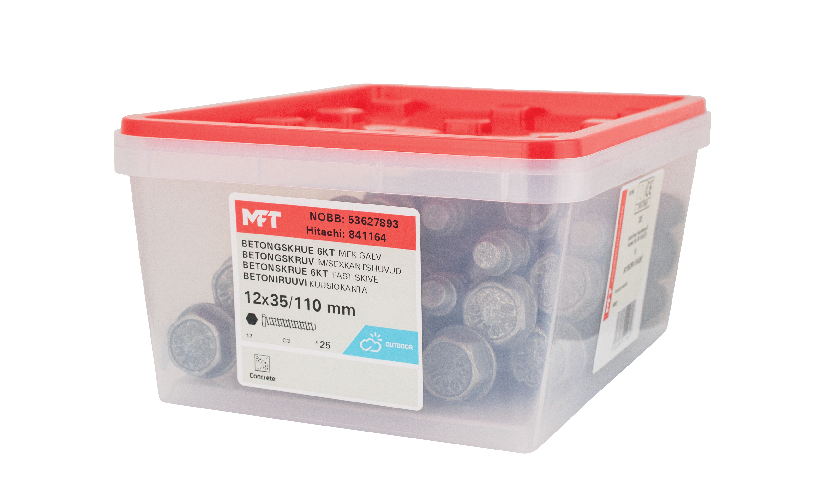 MFT Betongskrue OP1 for feste av sviller, skinner, beslag, treverk mot betong, hulltegl og kompakt tegl. For innvendig og utendørs bruk. Maks feste: 35 mm.