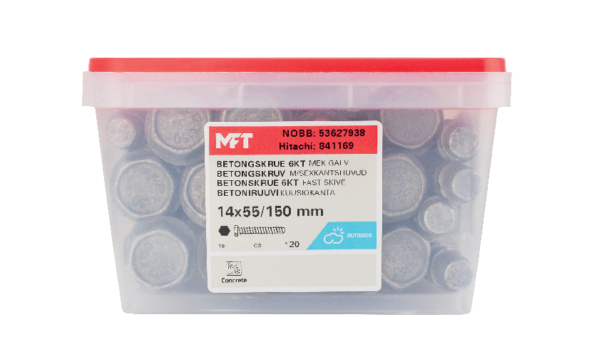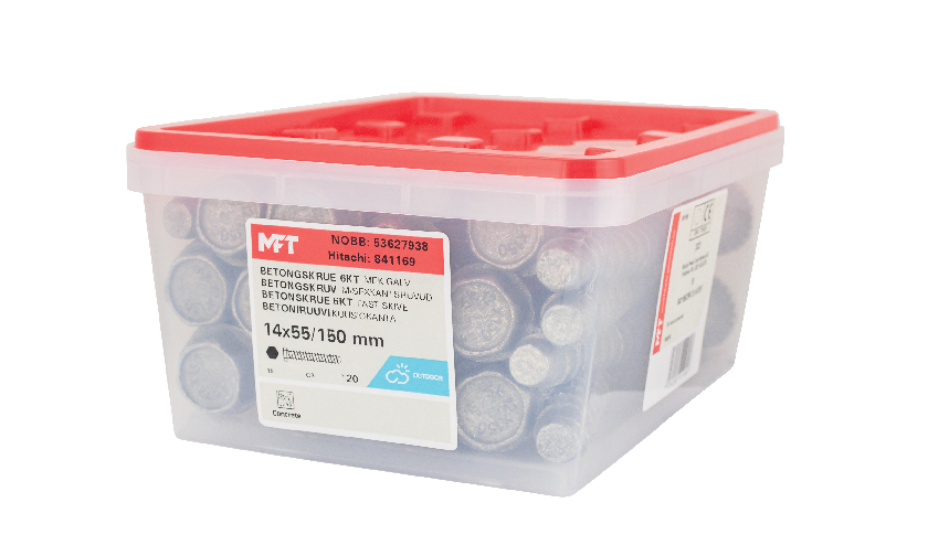 MFT Betongskrue OP1 for feste av sviller, skinner, beslag, treverk mot betong, hulltegl og kompakt tegl. For innvendig og utendørs bruk. Maks feste: 55 mm.
