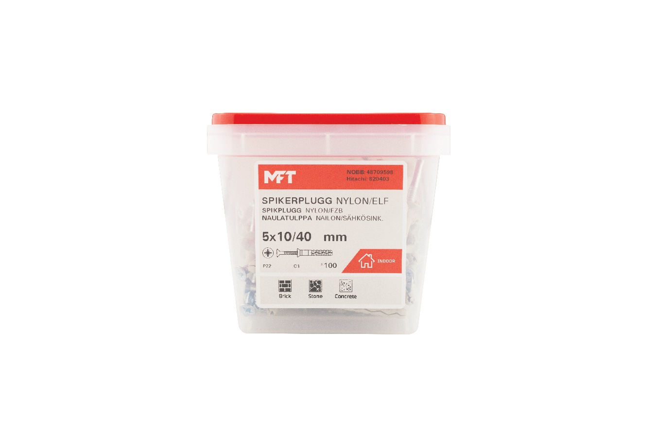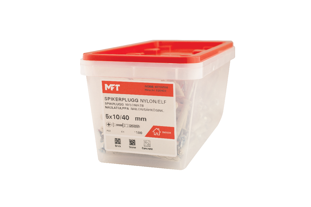MFT-nail plug is designed for easier installation of battens, skirting, linings, fittings, cabinets and in materials such as concrete, solid brick or natural stone. Easy to install: Drill a hole, press the Nail plug into place and hit the nail with a hammer. The design of the plug makes it expand quickly so it's not suitable to use in Leca or Siporex. To avoid fire nylon products should not be used in roof structures when temperature rises over +80°C.