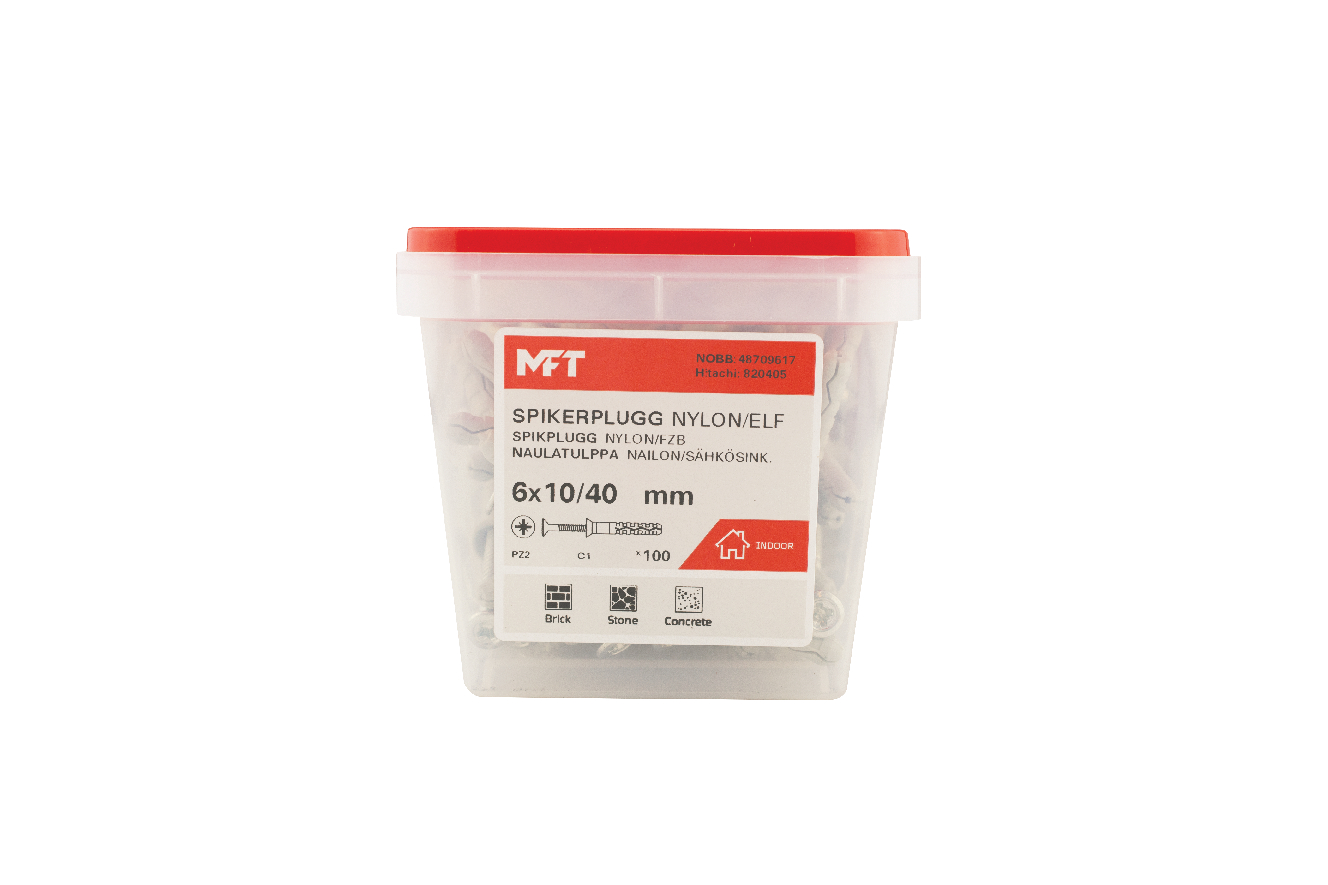 MFT-nail plug is designed for easier installation of battens, skirting, linings, fittings, cabinets and in materials such as concrete, solid brick or natural stone. Easy to install: Drill a hole, press the Nail plug into place and hit the nail with a hammer. The design of the plug makes it expand quickly so it's not suitable to use in Leca or Siporex. To avoid fire nylon products should not be used in roof structures when temperature rises over +80°C.
