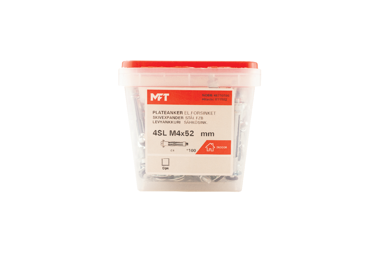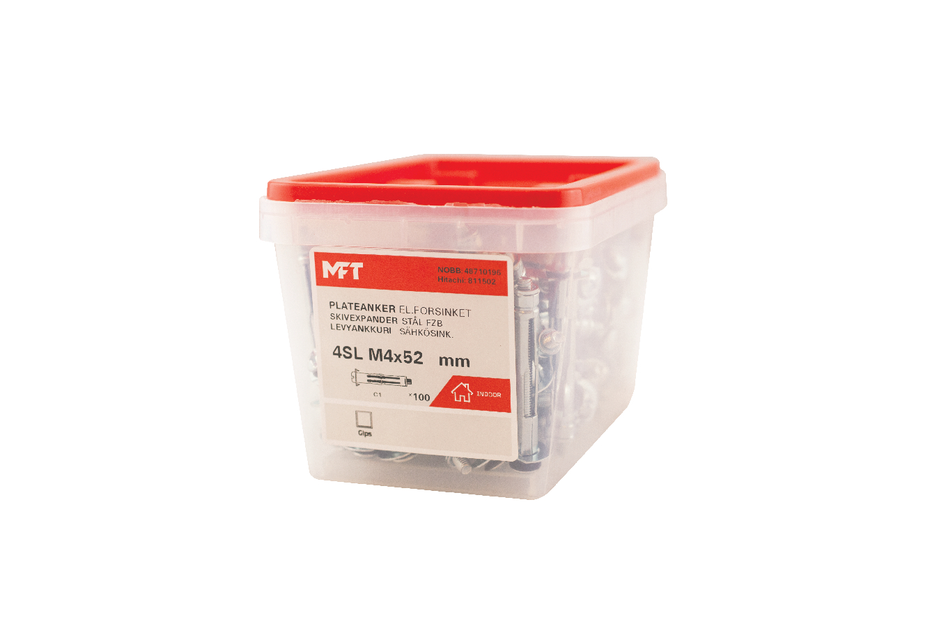 | Product no. | Maks skjær vegg gips 1 x 13 mm | Maks skjær vegg gips 2 x 13 mm | Maks uttrekk tak gips 1 x 13 mm | Maks uttrekk tak gips 2 x 13 mm | For plate- tykkelse | Bor- dim. | Anker- lengde | Skrue- dim. | Skrue- lengde |