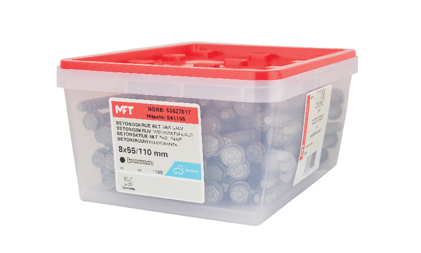MFT Betongskrue OP1 for feste av sviller, skinner, beslag, treverk mot betong, hulltegl og kompakt tegl. For innvendig og utendørs bruk. Maks feste: 55 mm.