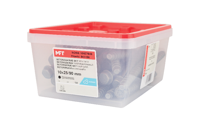 MFT Betongskrue OP1 for feste av sviller, skinner, beslag, treverk mot betong, hulltegl og kompakt tegl. For innvendig og utendørs bruk. Maks feste: 25 mm.