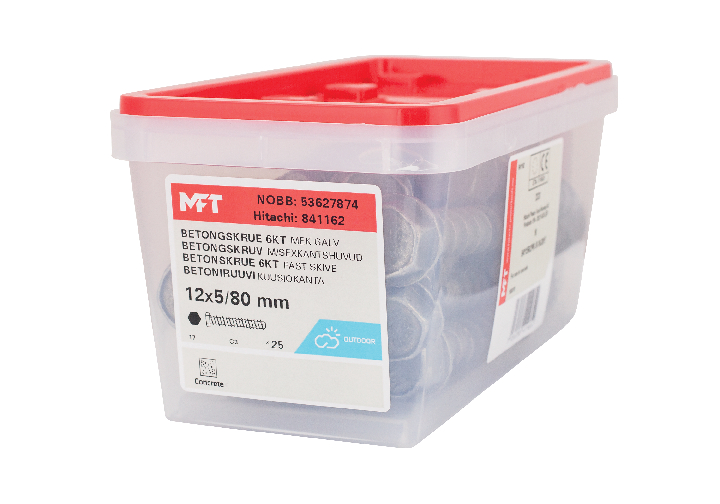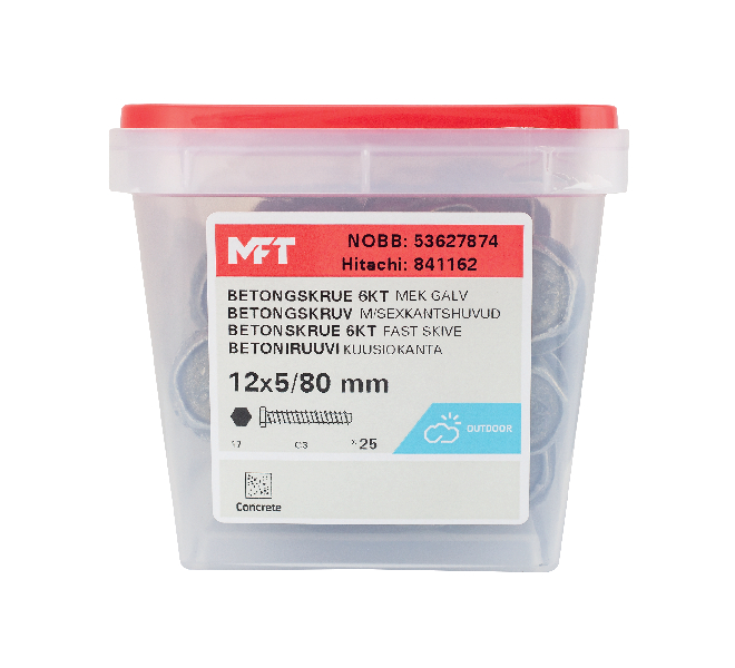 MFT Betongskrue OP1 for feste av sviller, skinner, beslag, treverk mot betong, hulltegl og kompakt tegl. For innvendig og utendørs bruk. Maks feste: 5 mm.